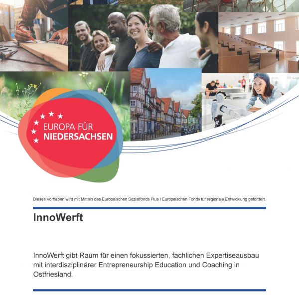 InnoWerft bietet Studierenden in Ostfriesland Raum für einen fokussierten, fachlichen Kompetenzentwicklung rund um Gründungen und Innovationen. Dank unserer modernen Räumlichkeiten im Co-Working-Stil, interdisziplinärer Entrepreneurship Education und individuellem Coaching fördern wir eine lebendige Gründungskultur an der Hochschule und machen sie für alle sichtbar. Unser Ziel ist es, Studierende bei der Umsetzung ihrer Ideen zu unterstützen und damit den Innovationsstandort Ostfriesland nachhaltig zu stärken. Das Projekt „InnoWerft“ wird von der europäischen Union kofinanziert und ist Teil der Europa für Niedersachsen Initiative.